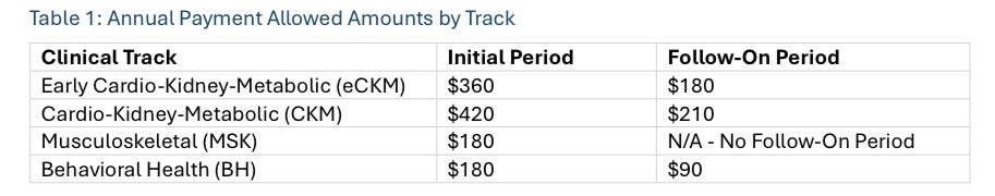 The headline numbers look modest enough to dismiss. Three hundred sixty dollars for early cardio kidney metabolic in the initial period. Four hundred twenty for full cardio kidney metabolic. One hundred eighty for musculoskeletal. One hundred eighty for behavioral health with a follow on at ninety. Those are annual allowed amounts per beneficiary, inclusive of Medicare and coinsurance. At first glance this feels like rounding error against total cost of care in any of these populations.