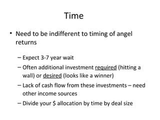 The third mistake is not thinking carefully enough about the timeline and the compounding nature of capital deployment. Angels assume they can front load their investments, build their portfolio quickly, and then just maintain it with occasional follow-ons. But the actual capital requirement peaks several years into your angel investing journey when you are simultaneously supporting multiple cohorts of companies at different stages. If you do not plan for this, you end up in a position where you are capital constrained at exactly the wrong time.