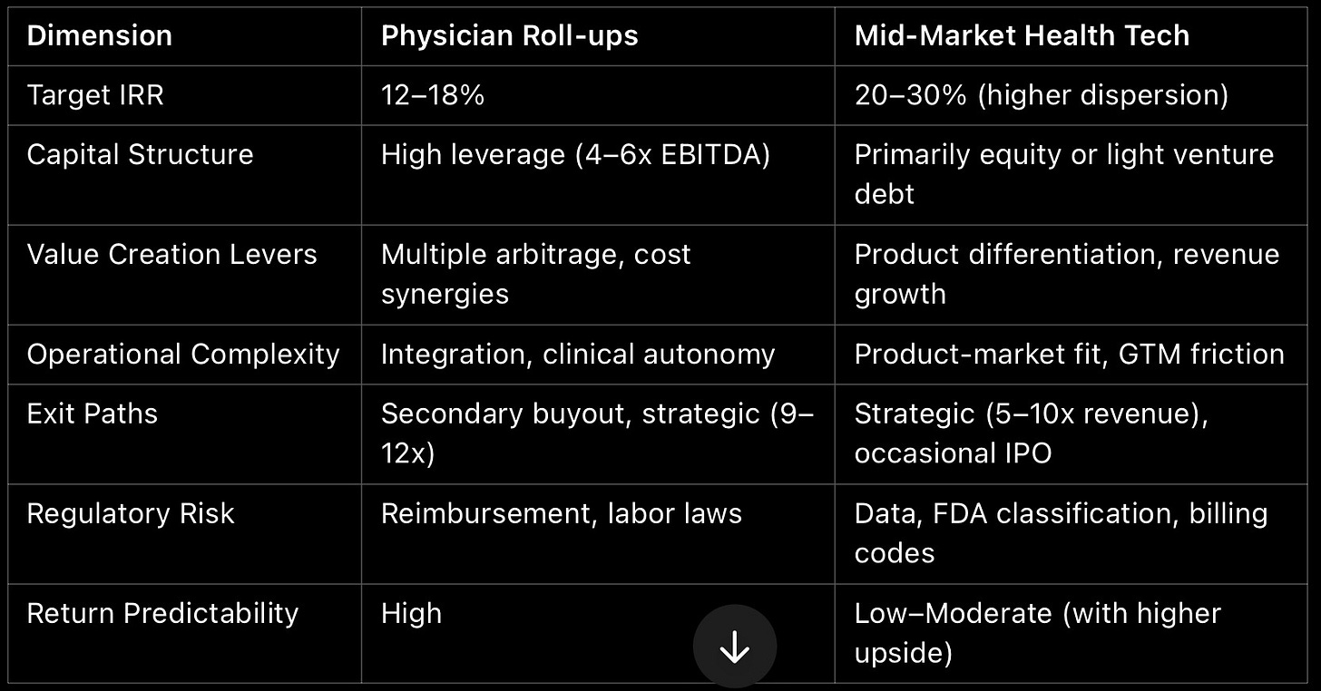 From a fund return perspective, this means physician roll-ups offer predictability and linearity, while health tech can deliver asymmetric upside but is more correlated to timing risk and macro conditions.