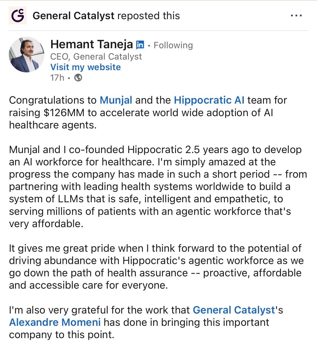 My read is that the category is real, the timing is right, and the companies that establish leadership now have a legitimate shot at building large, durable businesses. Whether Hippocratic specifically becomes one of those category leaders depends on execution over the next few years, but they’ve got the right ingredients to have a chance. The $126M round reflects investors making that same bet, and at this stage, that’s probably the right level of conviction to have. Not certainty, but enough confidence in the thesis and the team to put serious capital to work.