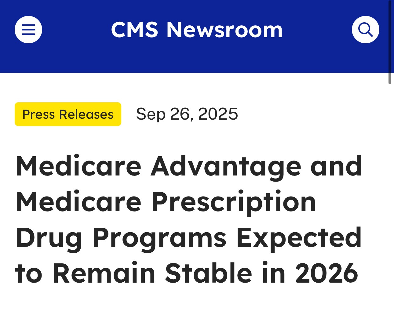 CMS's September 26, 2025 press release states that average premiums, benefits, and plan choices for 2026 Medicare Advantage (MA) and Part D are expected to remain stable, with projected declines in average premiums across both programs, near-universal access to MA options, and a slight decrease in the national count of MA plans from 5,633 to roughly 5,600.