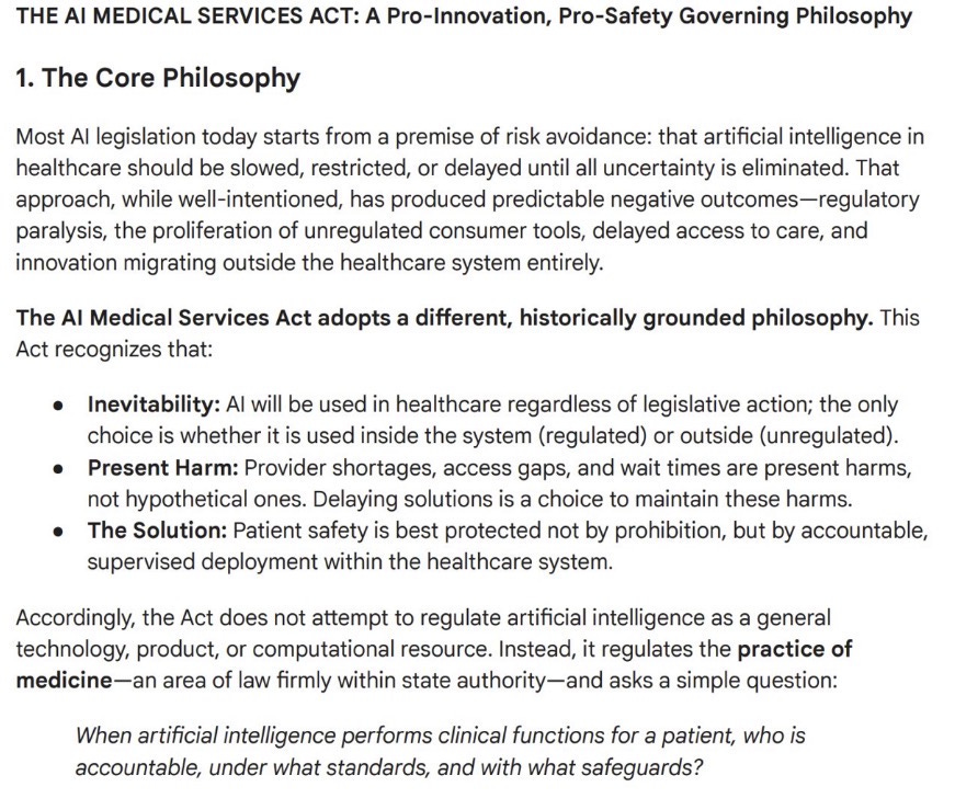 The AI Medical Services Act is better policy thinking than most of what gets produced in health tech legislation. The core diagnosis is correct. The access crisis is real, AI deployment is inevitable, and the choice is between accountable regulated deployment and unaccountable unregulated proliferation. The tiered risk framework is smart. The regulatory sandbox is genuinely useful for founders. The supervised deployment requirement is the right instinct even if the oversight mechanisms need strengthening. The bias monitoring and adverse event reporting requirements show technical sophistication that is rare in legislation.