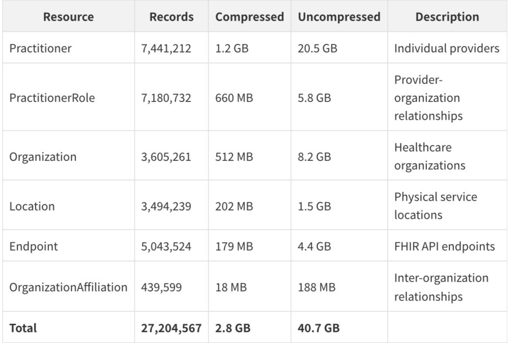 On April 9, 2026, the Centers for Medicare and Medicaid Services (CMS) released the National Provider Directory (NPD) - a single, public, FHIR-formatted dataset containing every Medicare-enrolled provider in the United States. The release, available at https://directory.cms.gov is the most comprehensive public healthcare provider dataset ever assembled. It contains 27,204,567 records across six FHIR resource types, compressed to 2.8 gigabytes and freely downloadable by anyone.