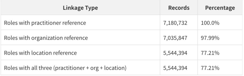 Every PractitionerRole record has a practitioner reference. 97.99% have an organization reference. 77.21% have a location reference. This means that for 77.21% of all provider-organization relationships, there is a complete three-way link connecting a specific person to a specific organization at a specific location.