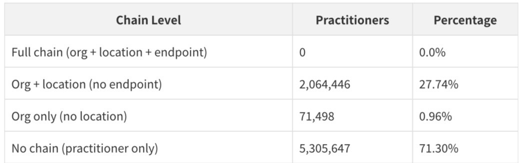 The finding that 0% of practitioners have a complete chain connecting them to an organization, a location, AND an endpoint is the most important structural insight in the entire dataset. The endpoint references in the Practitioner file use a different reference format than expected by the cross-resource join — the Endpoint file's records are linked through PractitionerRole and Organization, not directly through Practitioner extension references. This means the full five-resource chain (Practitioner → PractitionerRole → Organization → Location → Endpoint) exists for the 27.74% of practitioners who have both organizational and location linkage, but the endpoint leg of the chain runs through the organization, not the practitioner directly.