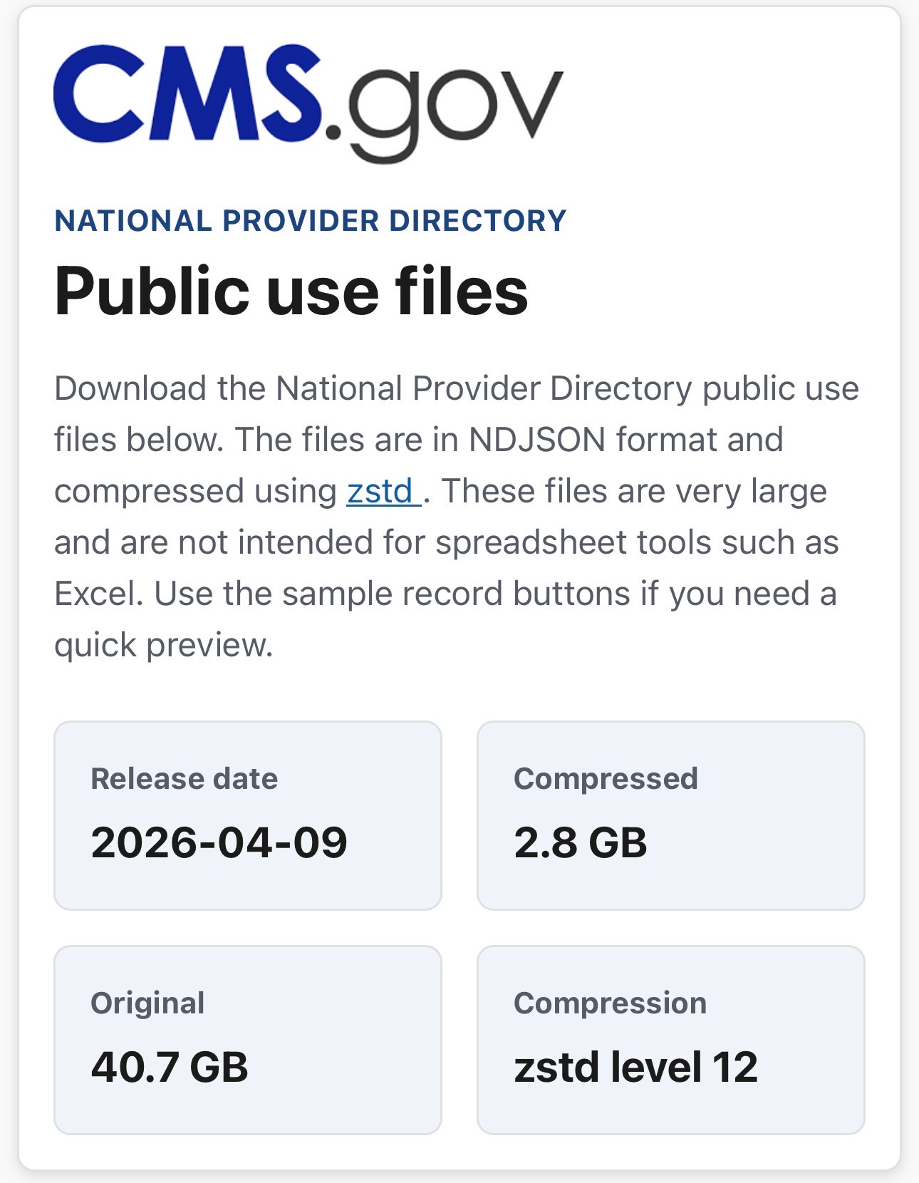 The format is NDJSON (newline-delimited JSON) compressed with Zstandard at level 12 - a modern, high-ratio compression algorithm that achieves roughly 14:1 compression on these files. Each line in each file is a complete, self-contained FHIR resource. The data was released under a public domain license with no restrictions on use.