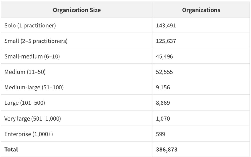 The organization size distribution reveals the extreme fragmentation of US healthcare delivery: