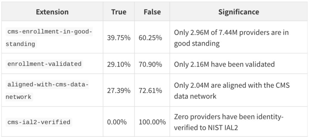 Every Practitioner record carries four CMS-specific boolean extensions that have no equivalent in any prior public dataset:
