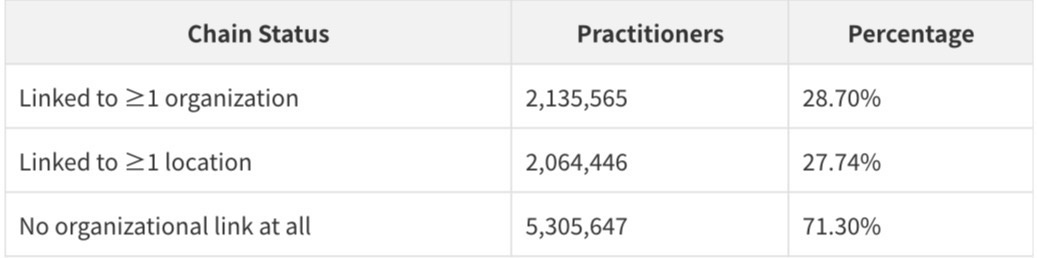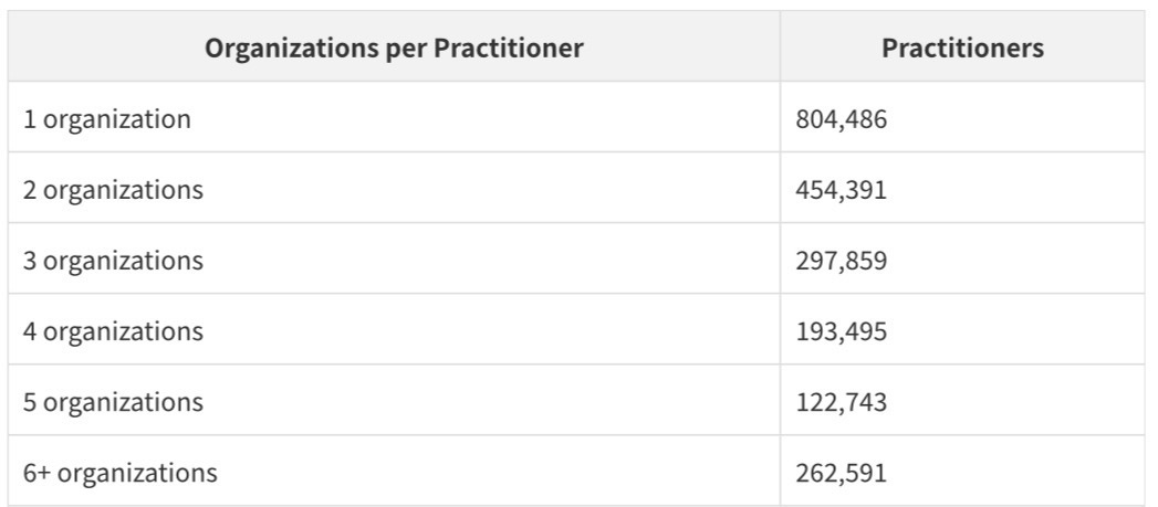 More than half of linked practitioners work across multiple organizations. This reflects the reality of modern medical practice: hospitalists who work at multiple hospitals, specialists who split time between academic medical centers and private practices, and behavioral health providers who contract with multiple group practices simultaneously.