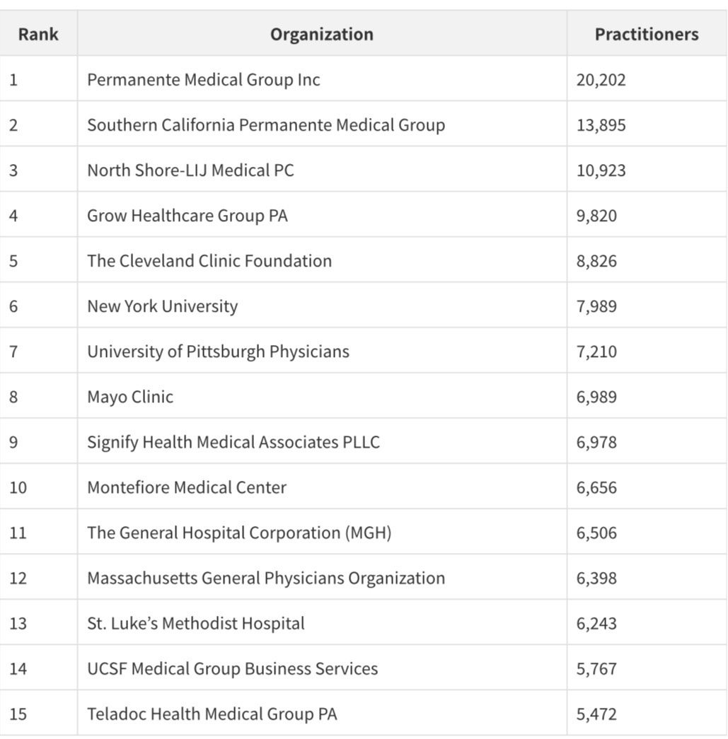 Kaiser Permanente's two medical groups together account for 34,097 practitioners - the largest single health system presence in the dataset. The appearance of Teladoc Health at #16 with 5,472 practitioners is a signal of how dramatically telehealth has scaled: a company that did not exist as a significant healthcare entity a decade ago now employs more Medicare-enrolled providers than most major academic medical centers.