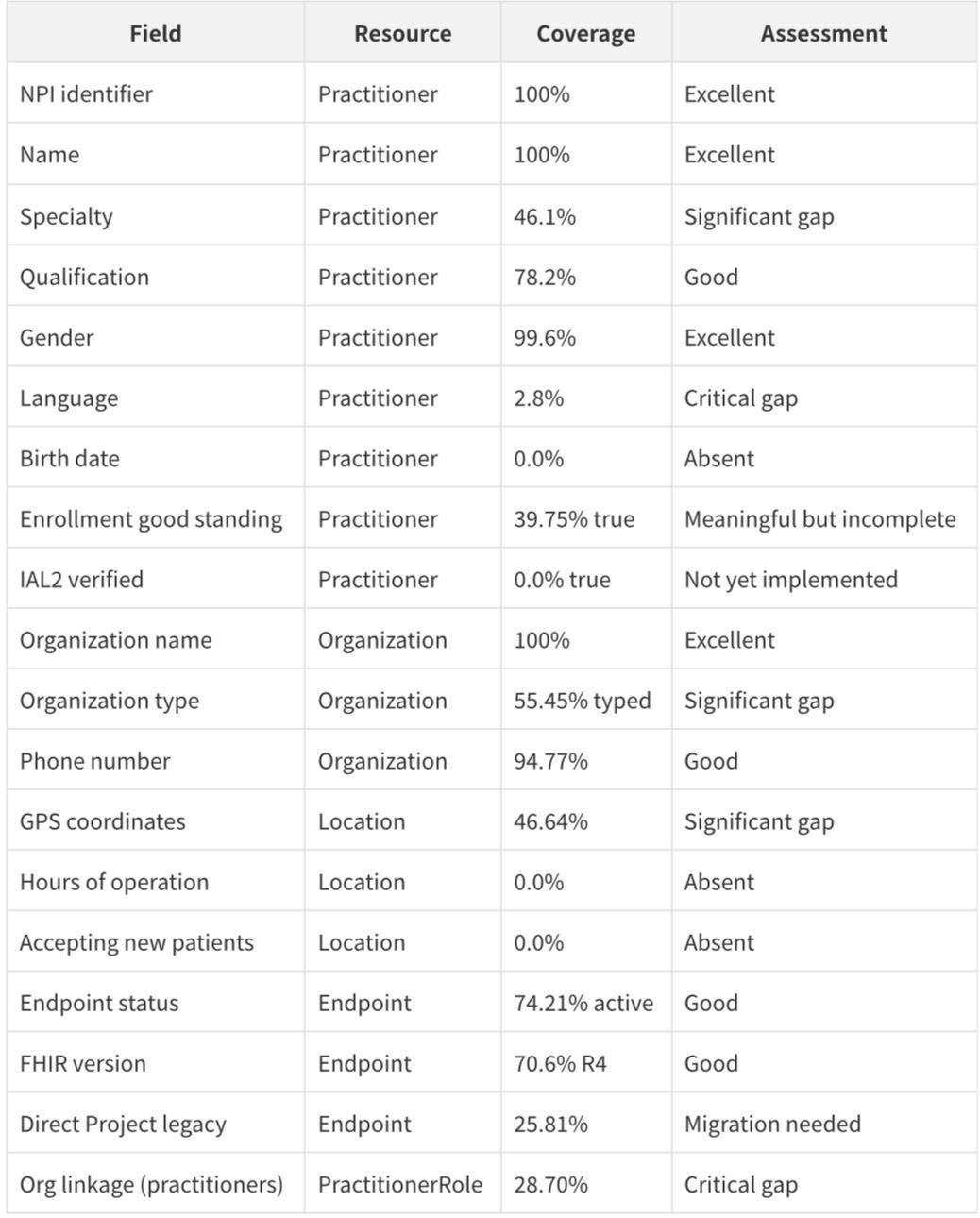 The overall picture is of a dataset that is excellent on identity (NPI, name, organization name) but incomplete on operational data (hours, availability, accepting patients) and connectivity (only 28.70% of practitioners are linked to organizations). This is consistent with a first release that prioritizes enrollment data over operational data.