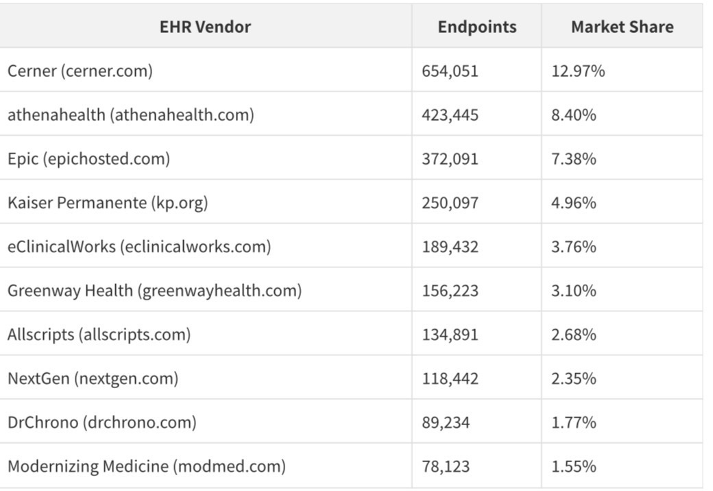 The 12.97% Cerner market share, 8.40% athenahealth share, and 7.38% Epic hosted share are the first population-level EHR market data ever made publicly available. For any company that sells into healthcare, this data is more valuable than any analyst report.
