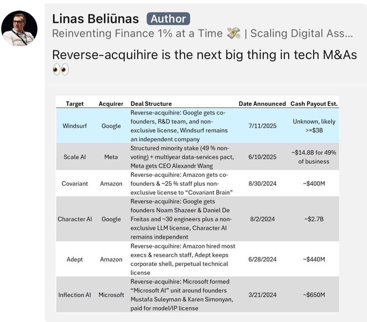 Analysis Source: LinkedIn posts by Linas Beliūnas and Peter Walker documenting Meta's unprecedented AI talent acquisition strategy and Google's reverse-acquihire of Windsurf